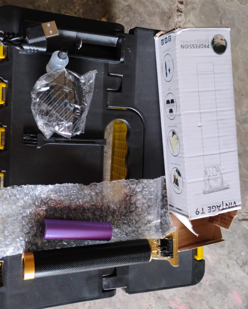 The Vintage T9 Professional Hair Trimmer is an elegantly designed grooming tool crafted for precision trimming, edging, and shaping of beard, mustache, and hairlines. Equipped with a powerful motor, gold-plated T-blade, and non-slip ergonomic black handle, this cordless trimmer ensures smooth and accurate cuts every time. The rechargeable lithium battery offers extended runtime and comes with a USB charging dock, making it ideal for home and travel use.